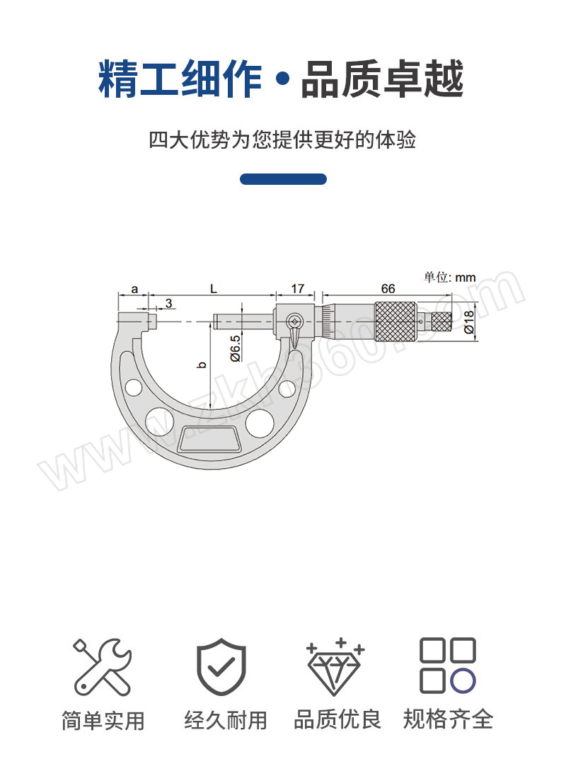 ·分度值:0.001mm。 ·棘轮测力。 ·硬质合金测量面。 ·配标准杆(除0-25mm外)。
