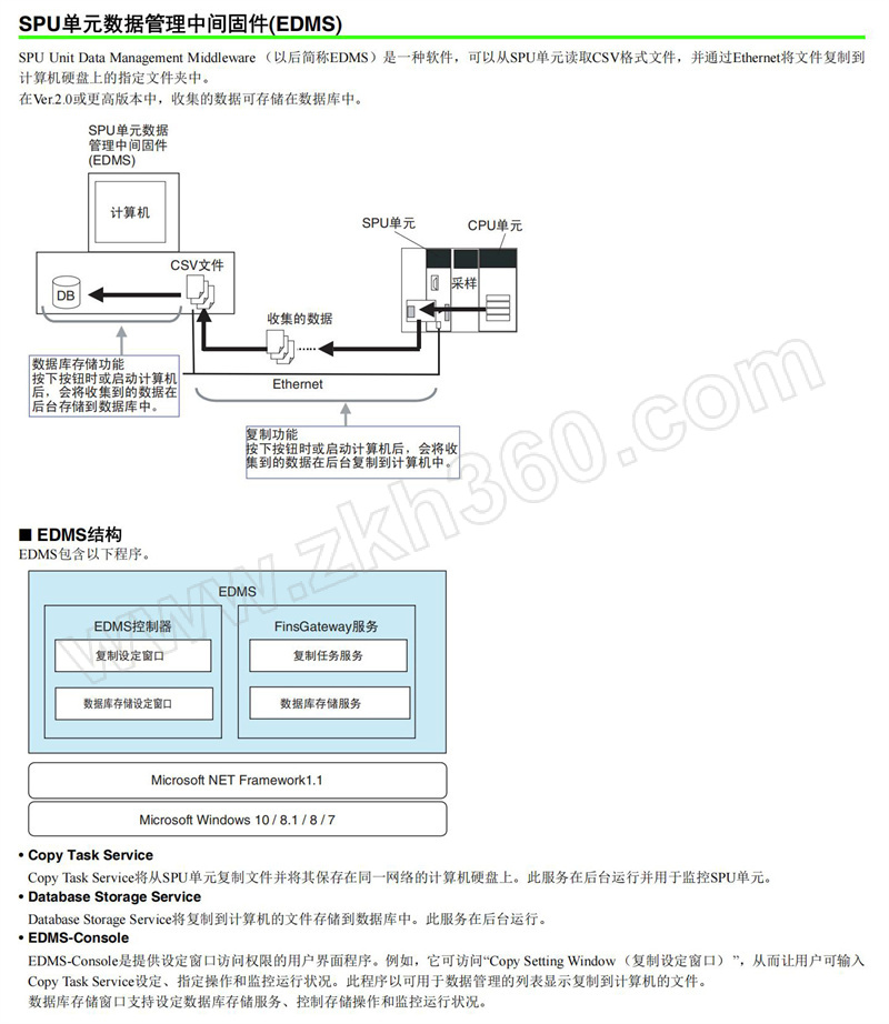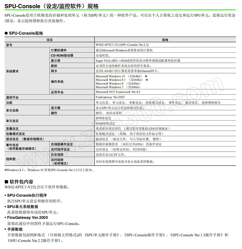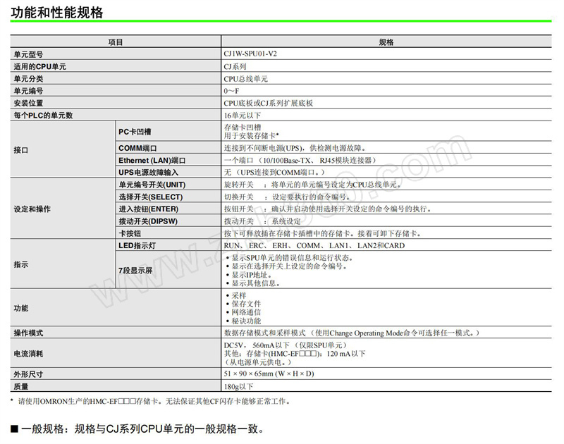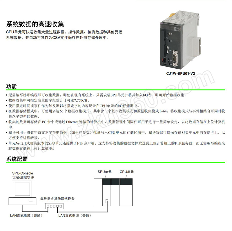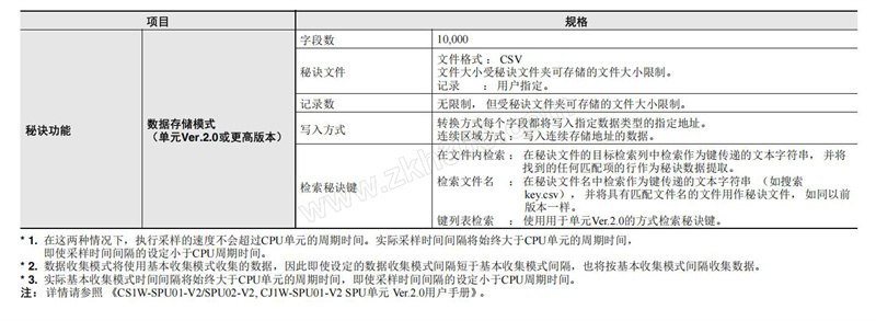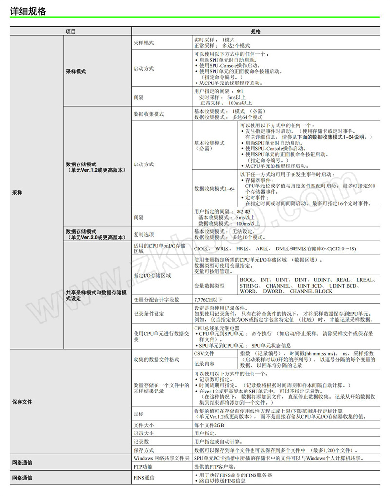 ·无需编写梯形编程即可收集数据。即使在现有系统上,只需安装SPU单元并将其加入I/O表,即可开始数据收集 ·数据收集中可指定变量的字段数合计可达7,776CH ·使用指定时间或事件作为触发器以将指定字的内容记录在CPU单元的I/O存储器中 ·在数据存储模式中,可使用多达65个数据收集模式,其中含一个基本收集模式和数据收集模式1~64 ·收集的数据可存储在PC 卡中或通过Ethernet 连接的计算机中
