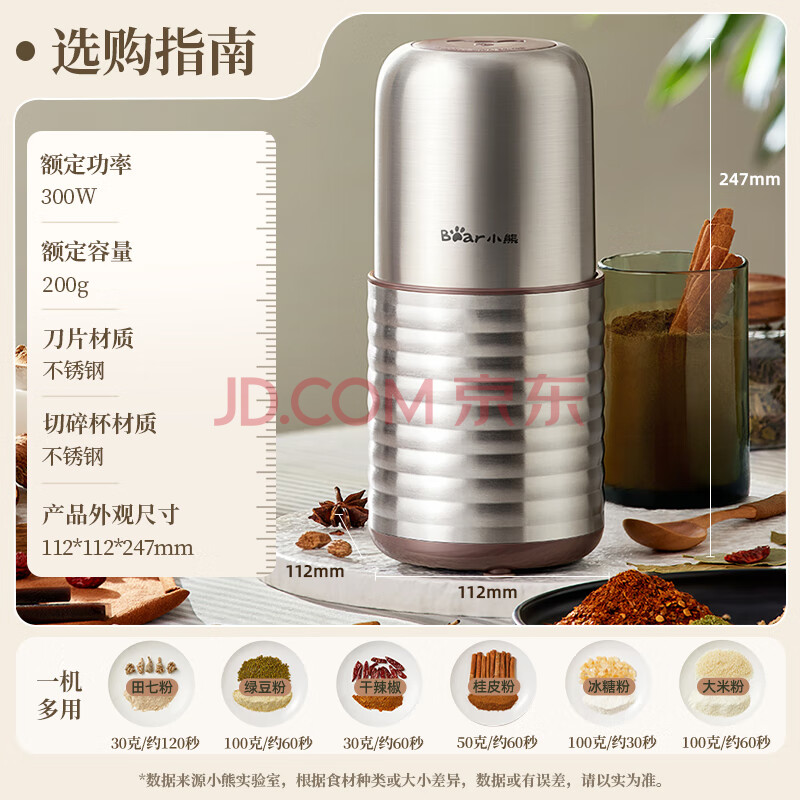 小熊(Bear)研磨机 家用磨粉机 打粉机 中药粉碎机 料理机 干粉机 不锈钢打粉研磨机FSJ-A03E1