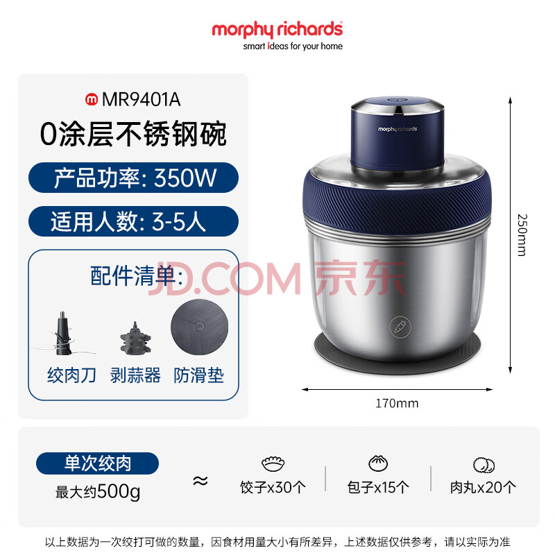 摩飞电器(Morphyrichards)年货送礼绞肉机套娃家用和面机饺子肉馅机多功能辅食佐料打蒜搅拌机0涂层全不锈钢1.5L MR9401A
