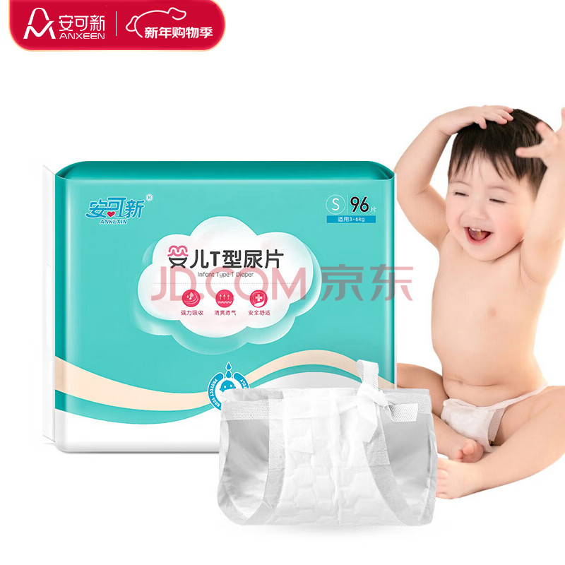 安可新 婴儿T型尿片【96片】三角巾尿裤新生儿一次性隔尿垫拉拉裤S号