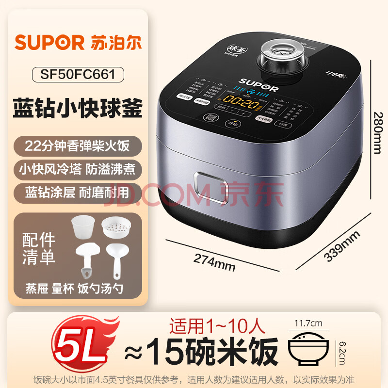 苏泊尔(SUPOR)电饭煲4-5人大容量5升蓝钻小快球釜内胆家用不粘柴火饭多功能微压智能电饭锅SF50FC661