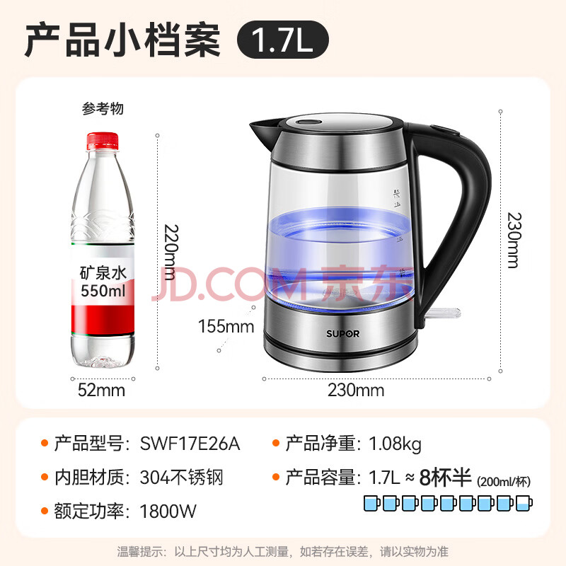 苏泊尔(SUPOR)玻璃电水壶热水壶高硼硅玻璃电热水壶 1.7L烧水壶 SWF17E26A
