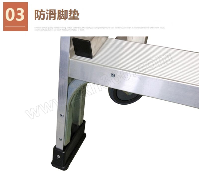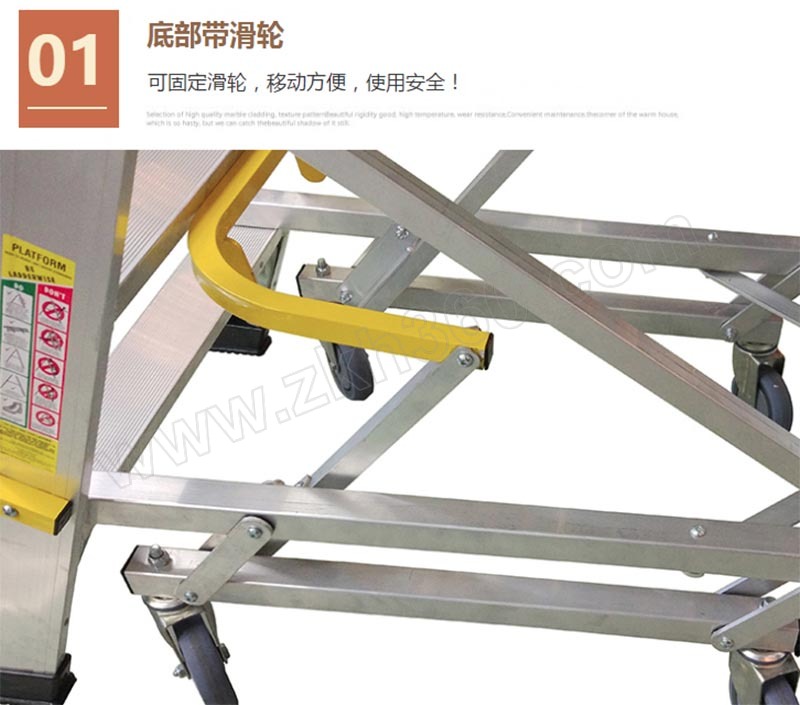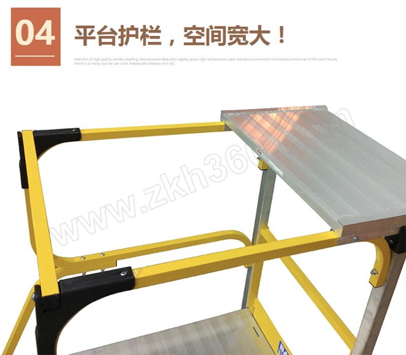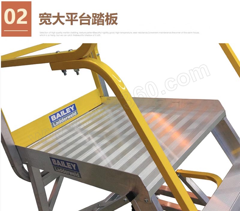 ·主体航空铝合金材质,额定承重170KG ·踏板宽度100mm,长度由下至上递减,间距300mm左右 ·超大平台590×800mm,四面带有高度为900mm的围栏 ·可转换为标准平台、过道式平台梯、带货物托盘式平台梯等模式 ·超大静音万向橡胶脚轮,轮径125mm,无刹车 ·符合澳洲产品标准:AS/NZS 1892.1
