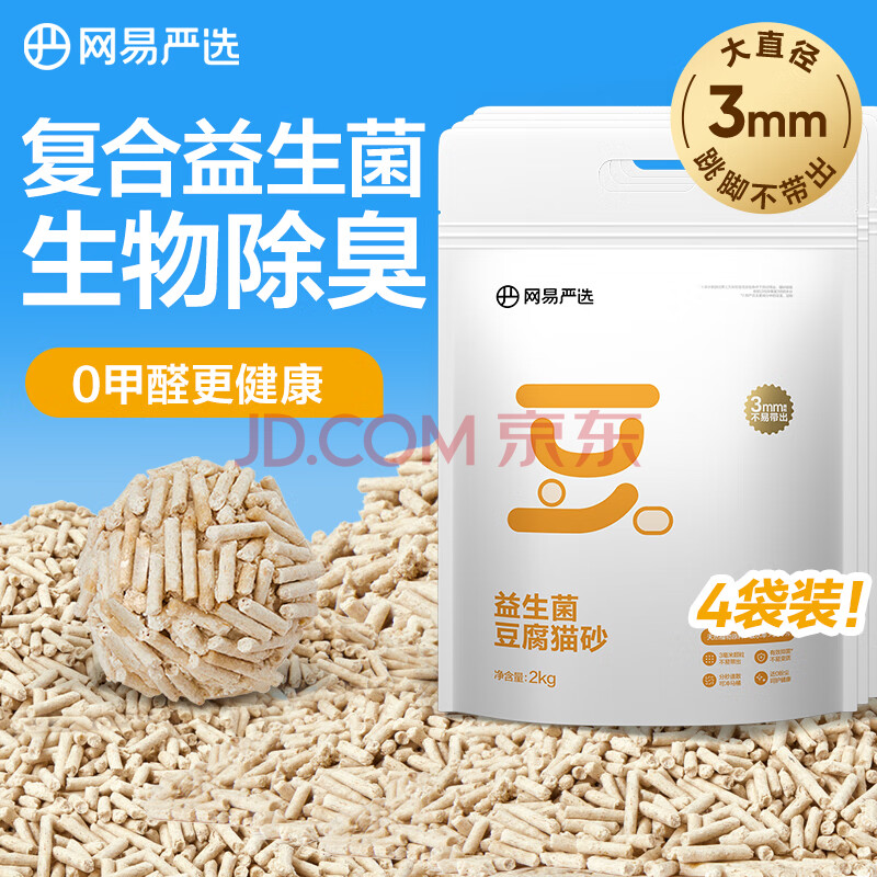 网易严选益生菌豆腐猫砂去异味可冲厕所3mm大直径除臭猫砂 2kg*4包