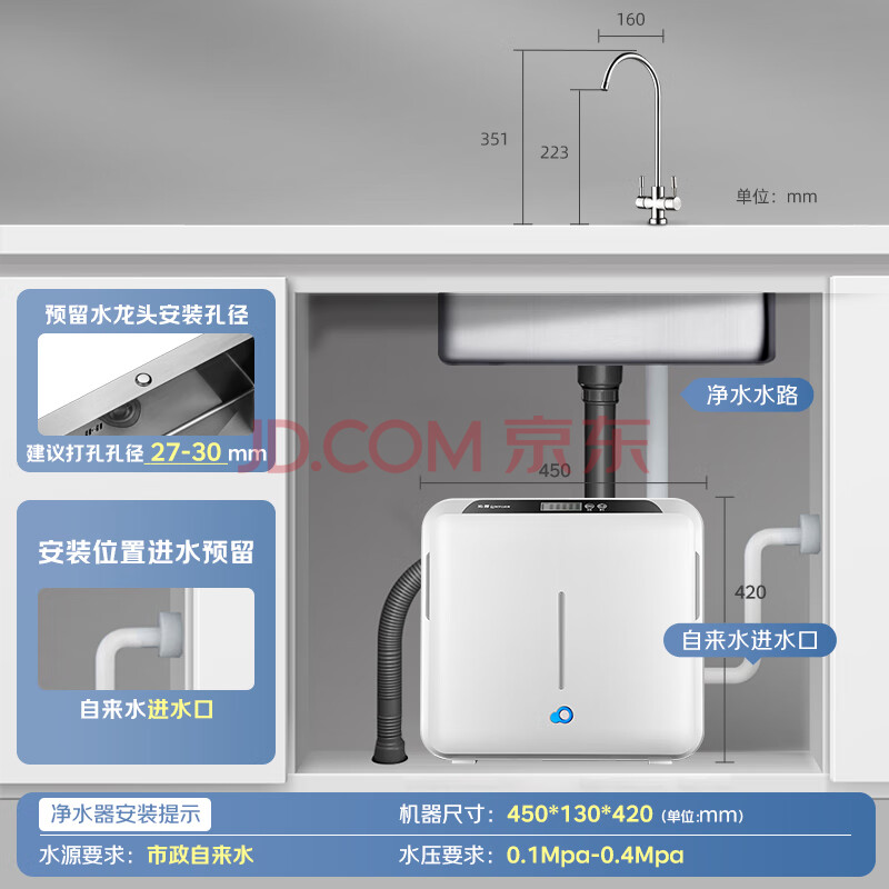 净水器 × 1 鹅颈龙头 × 1 零件包 × 1 PE管 × 1 说明书 × 1 保修卡 × 1 合格证 × 1 维修保养手册 × 1