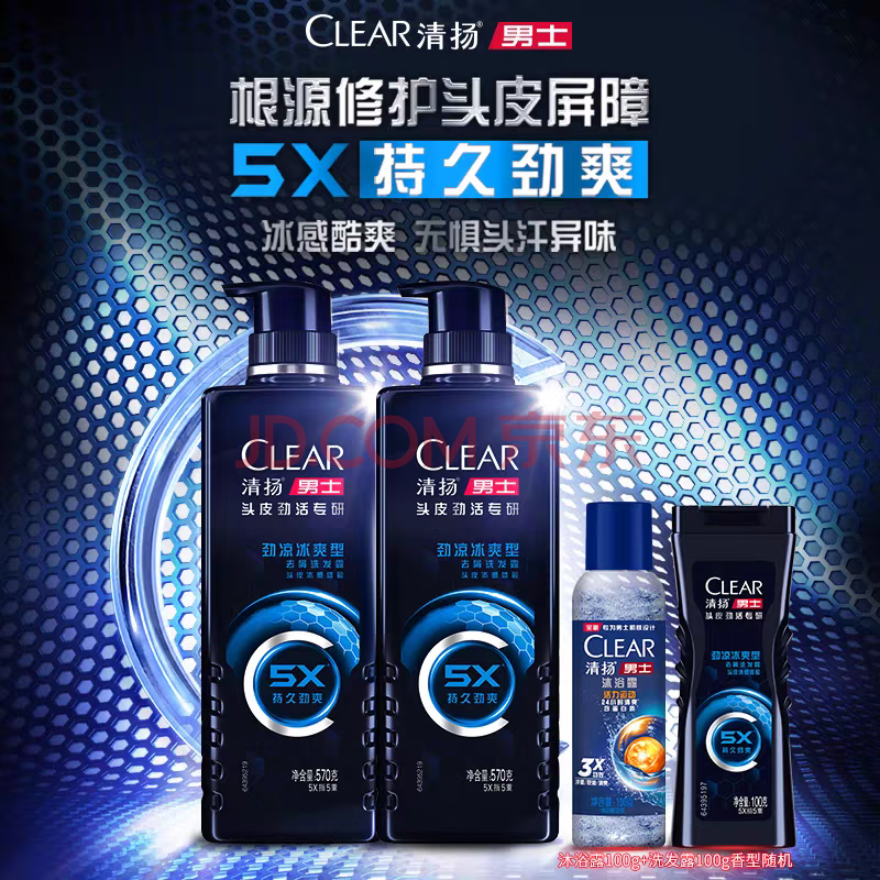 清扬男士头皮专研劲凉冰爽洗发水570gX2+洗发100g+沐浴100g 新老包装
