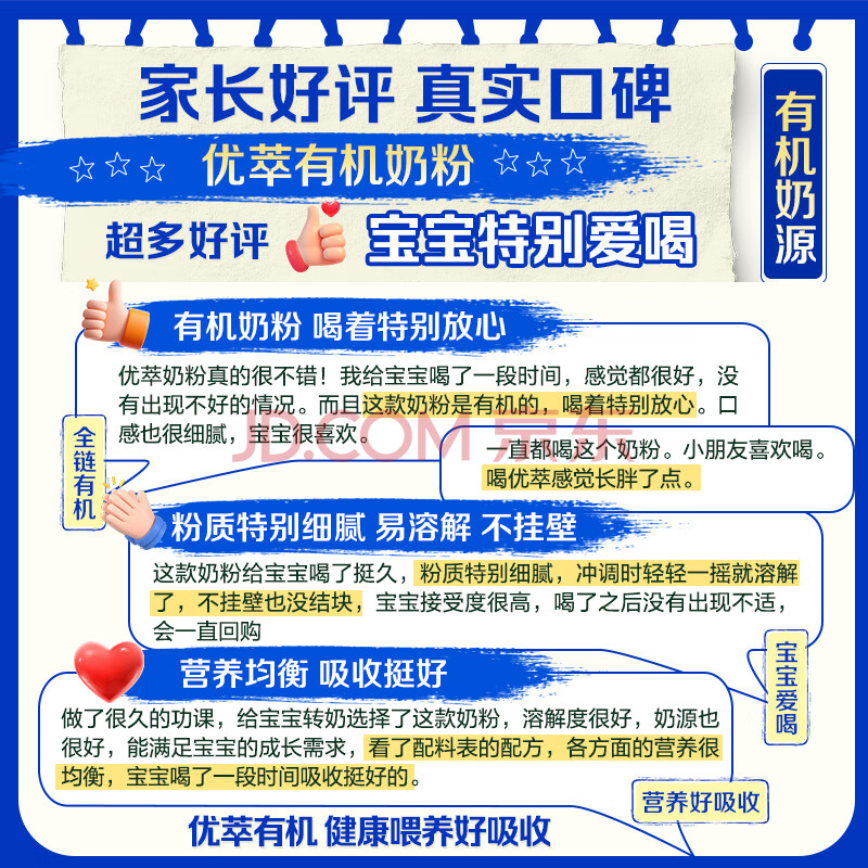 君乐宝(JUNLEBAO)有机优萃3段幼儿配方奶粉(12-36月龄)800g听装
