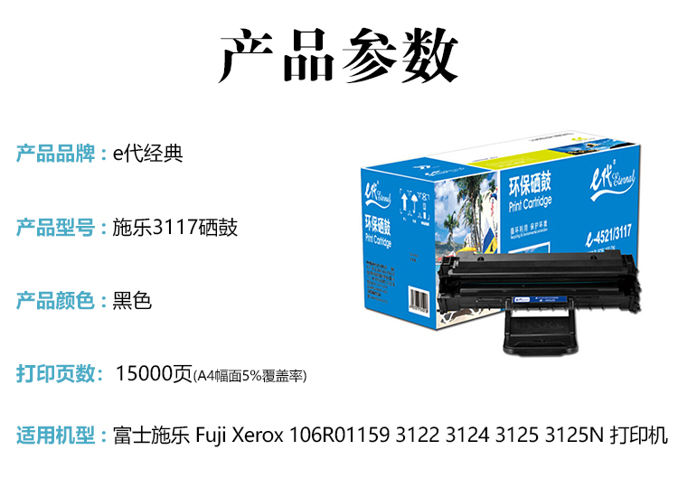 e代经典3117硒鼓(鼓粉一体)单只装黑色(支)适用机型:富士施乐FujiXerox3117;3122;3124;3125;3125N打印量:3000