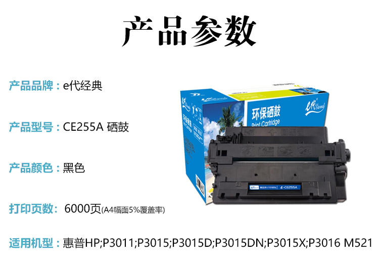 e代经典HP CE255A硒鼓黑(单位:支) (适用:惠普HP;P3011;P3015;P3015D;P3015DN;P3015X;P3016)