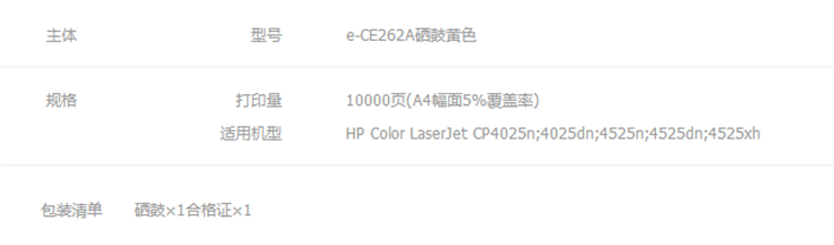 e代经典HP CE262A 648a硒鼓黄(单位:支) (适用: CP4025n;4025dn;4525n;4525dn;4525xh)