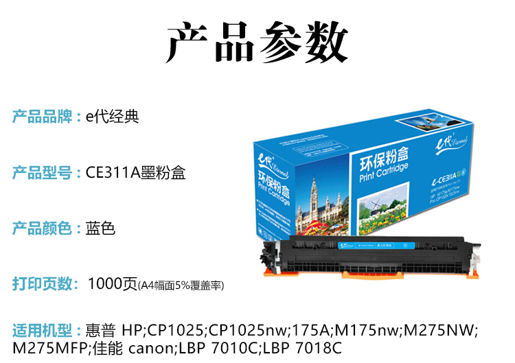 e代经典HP CE311A粉盒(不含鼓组件)蓝(单位:支)适用机型: 惠普 HP;CP1025;CP1025nw;175A;M175nw;M275NW; M275MFP;佳能 canon;LBP 7010C;LBP 7018C