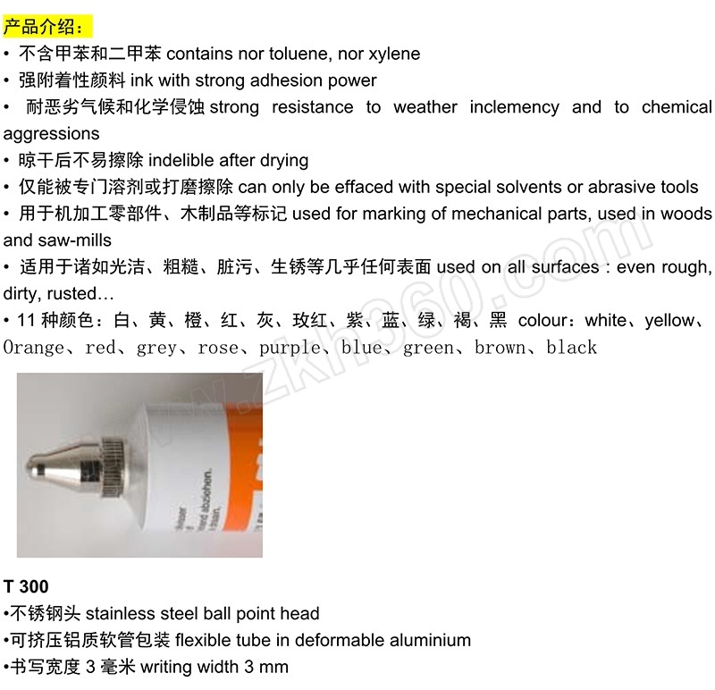 ·不含甲苯和二甲苯 ·强附着性颜料 ·耐恶劣气候和化学侵蚀 ·晾干后不易擦除 ·仅能被专门溶剂或打磨擦除 ·用于机加工零部件、木制品等标记 ·适用于诸如光洁、粗糙、脏污、生锈等几乎任何表面