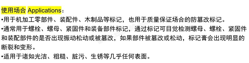 ·用于机加工零部件、装配件、木制品等标记,也用于质量保证场合的防篡改标记。 ·通常用于螺栓、螺母、紧固件和装备部件标记,通过标记可目觉检测螺母、螺栓、紧固件和装配部件的是否出现振动松动或被篡改,如果部件被篡改或松动,标记膏会出现明显的断裂和变形。 ·适用于诸如光洁、粗糙、脏污、生锈等几乎任何表面。·
