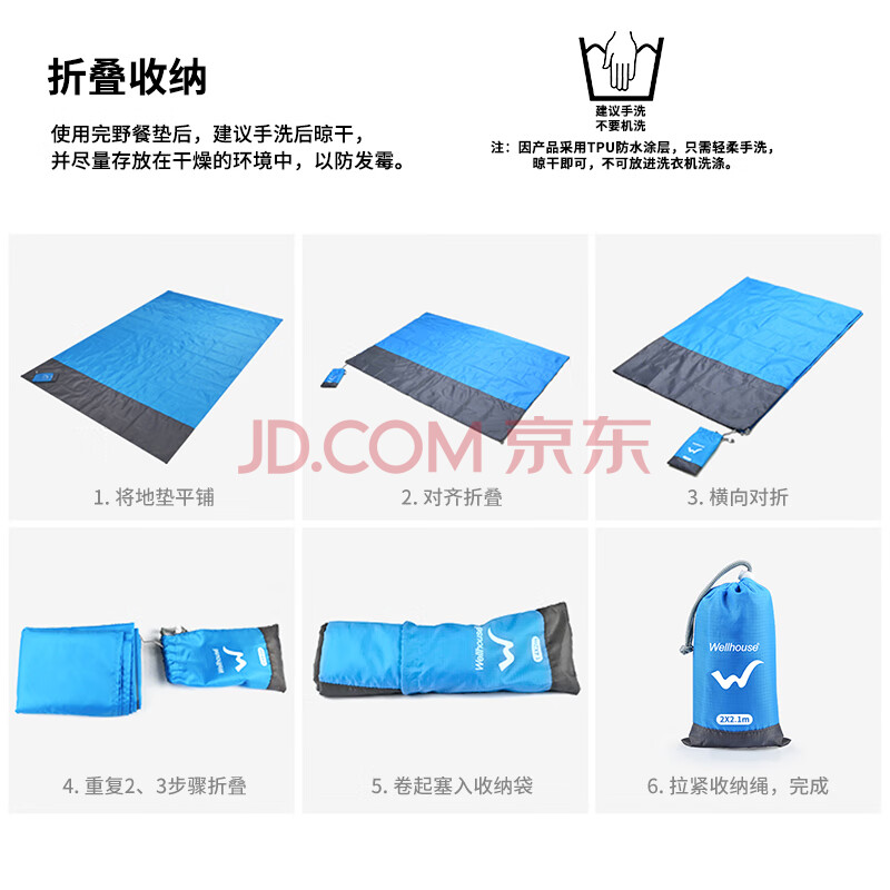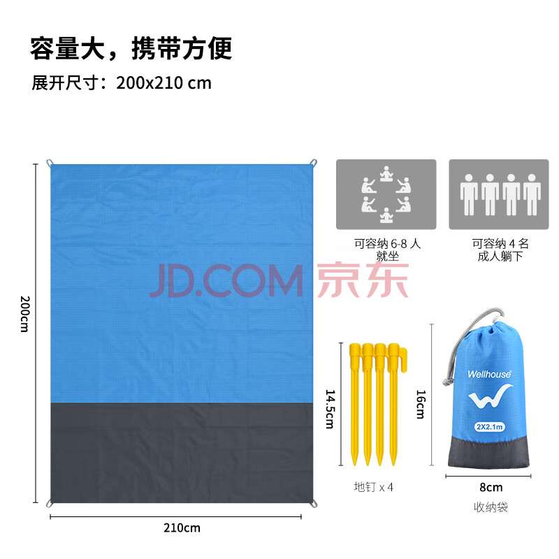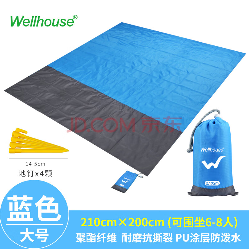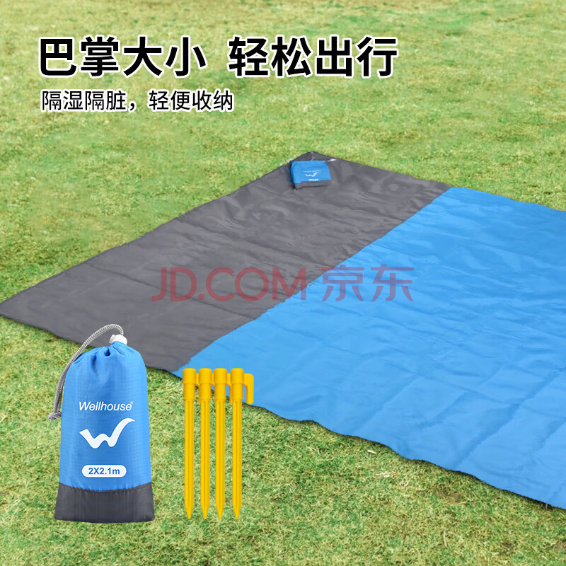 WELLHOUSE户外沙滩折叠防潮垫野餐垫便携收纳袋带地钉蓝灰色2.1*2m