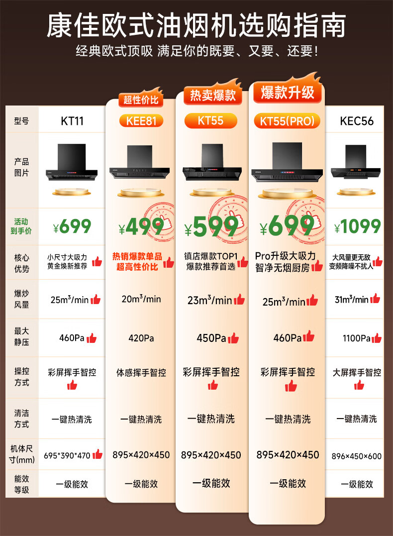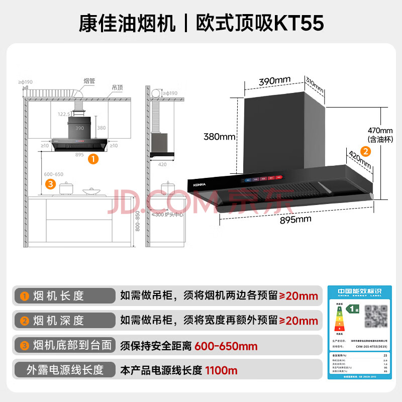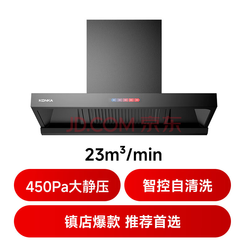康佳(KONKA)欧式顶吸抽排油烟机 爆款TOP家用T型23m³爆炒大吸力彩屏智控一级能效自净清洗CXW-265-KT55(DE19)