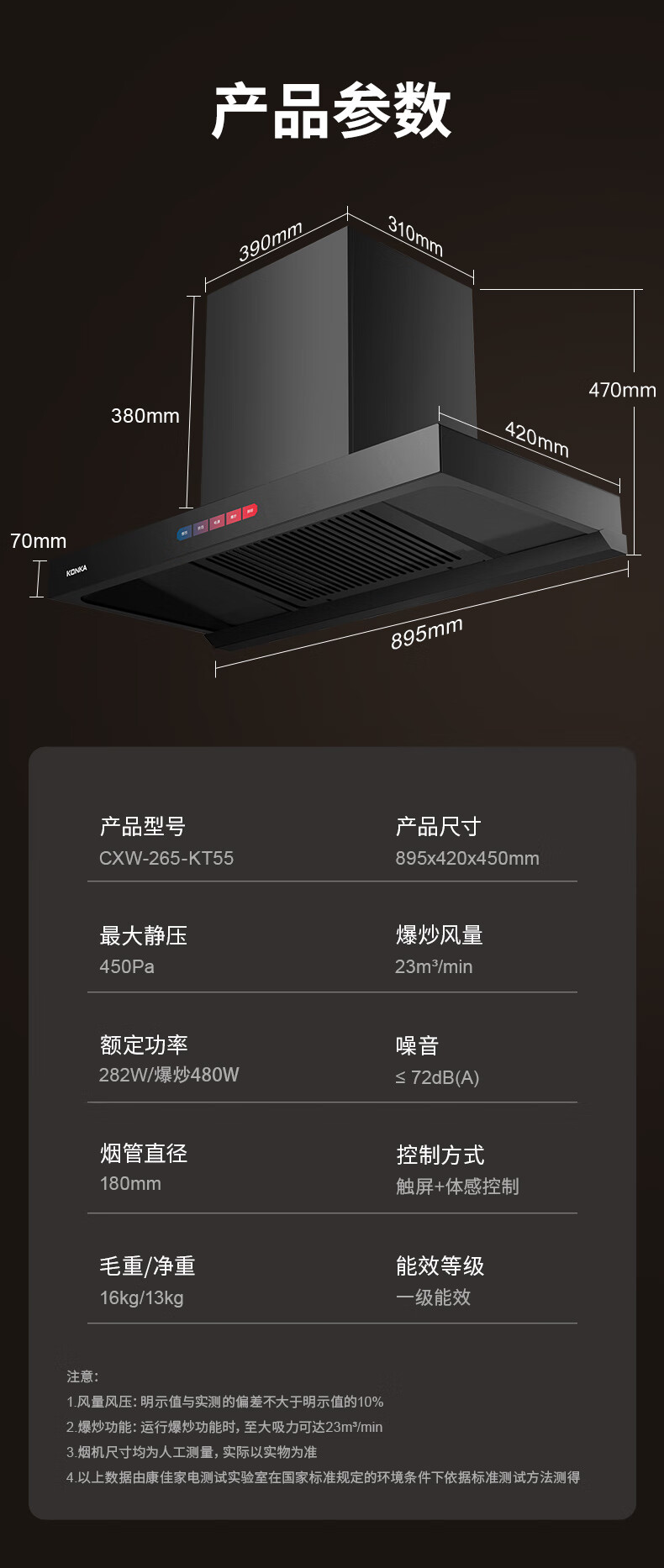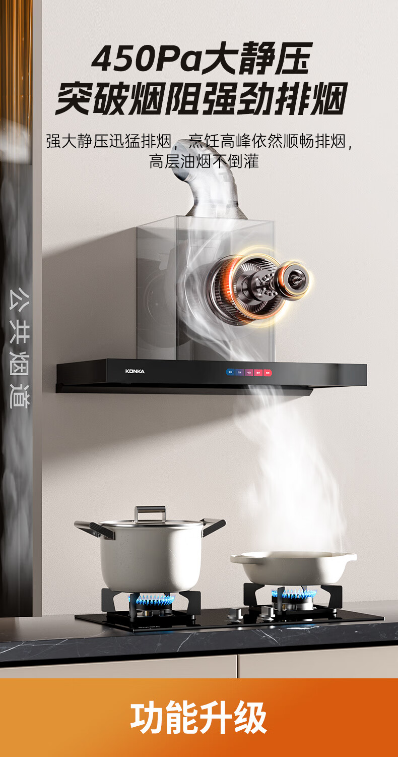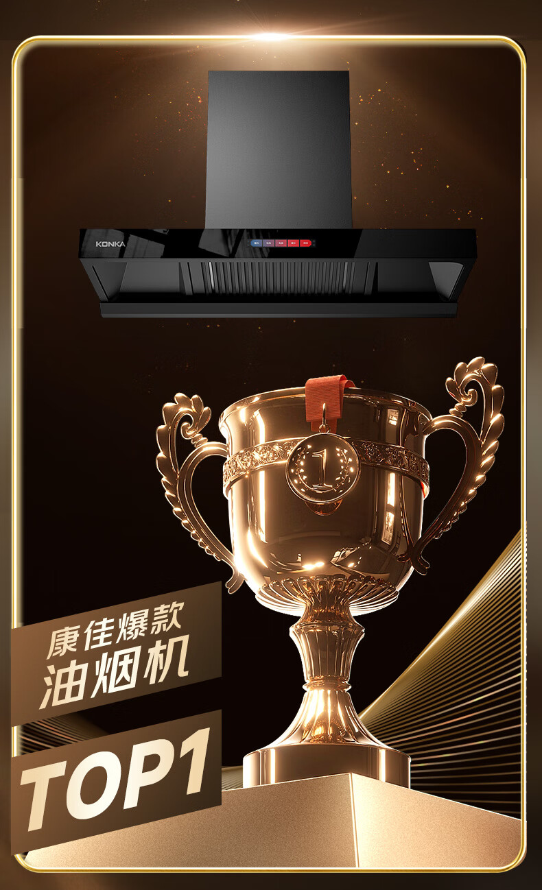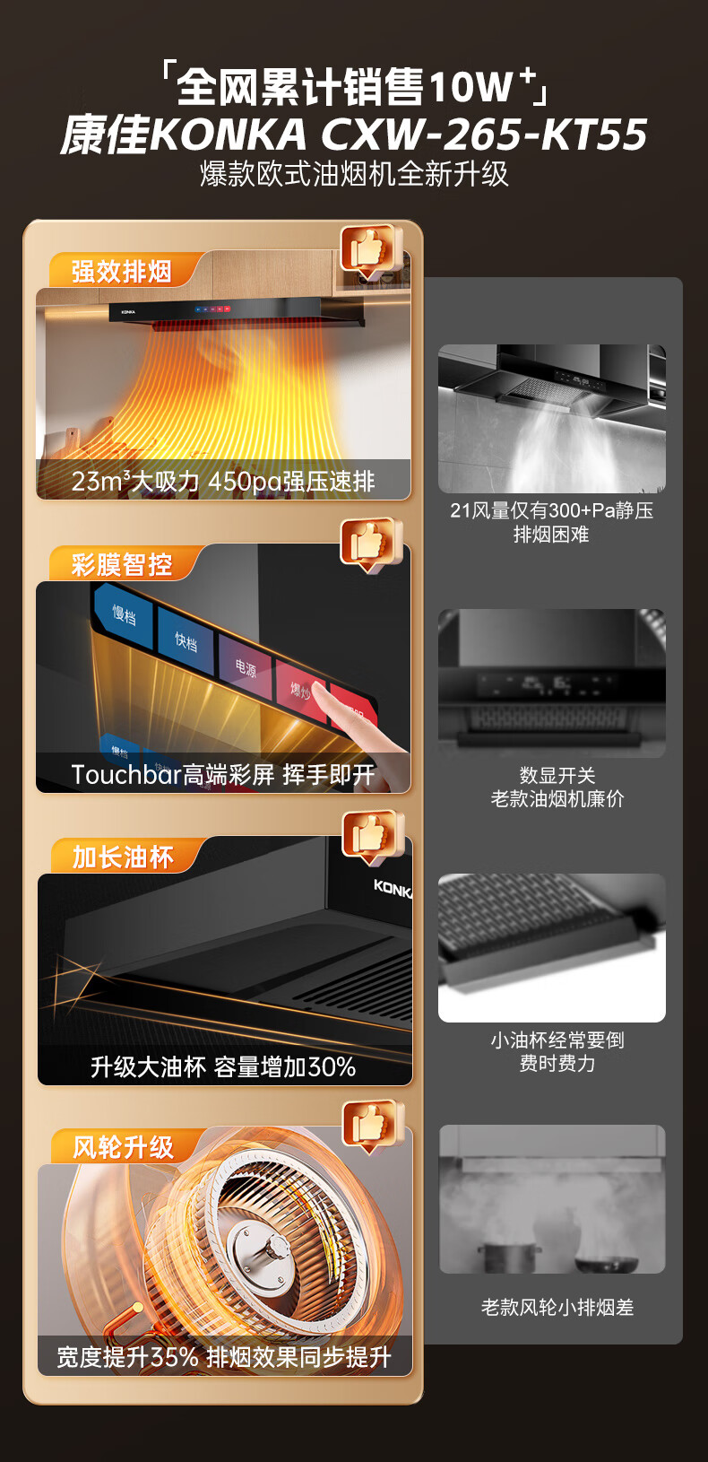 康佳(KONKA)欧式顶吸抽排油烟机家用T型 23m³大吸力 彩屏挥手智控自清洗 CXW-265-KT55