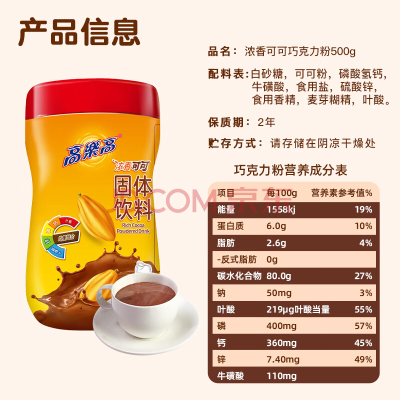 高乐高 可可粉 浓香巧克力粉牛奶即食早餐伴侣 健康食品 500g/罐