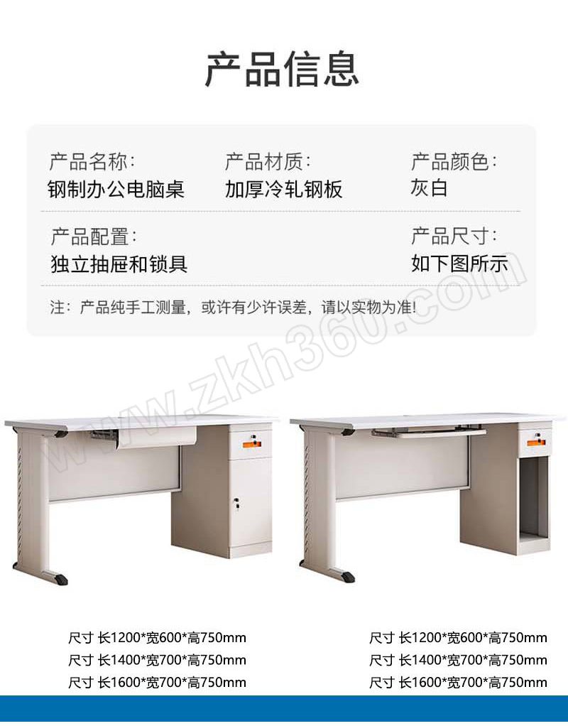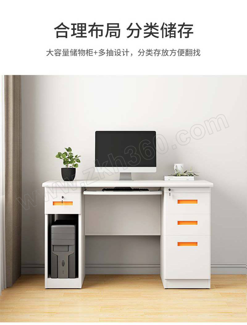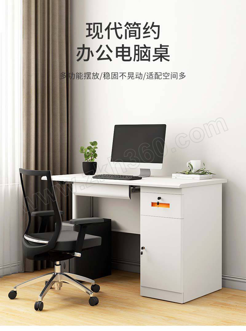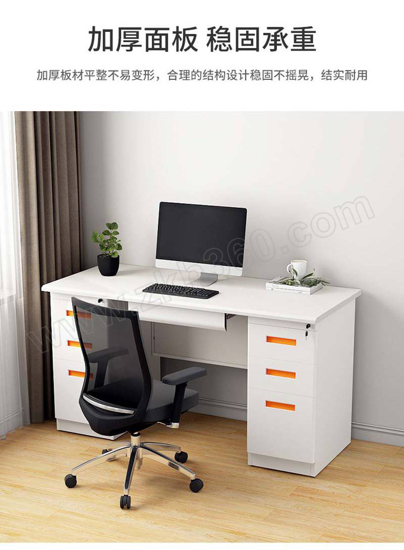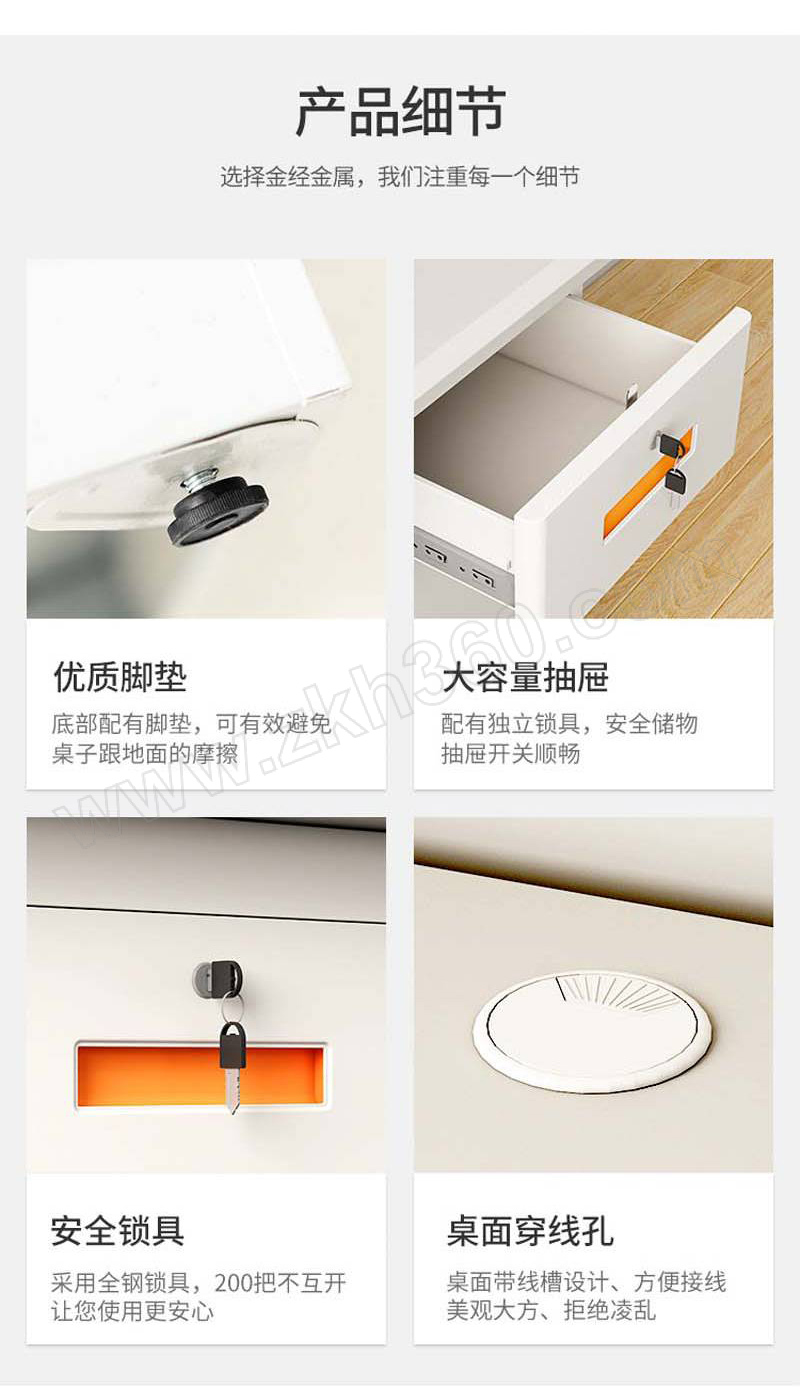·宽大台面,环保材质;·精美拉手,坚固耐磨,简约大方;·采用全钢锁具,200把不会开;·台面左右均设有走线孔,隐蔽线路节省空间;·采用静音滑轨,抽拉顺畅,坚固顺滑。