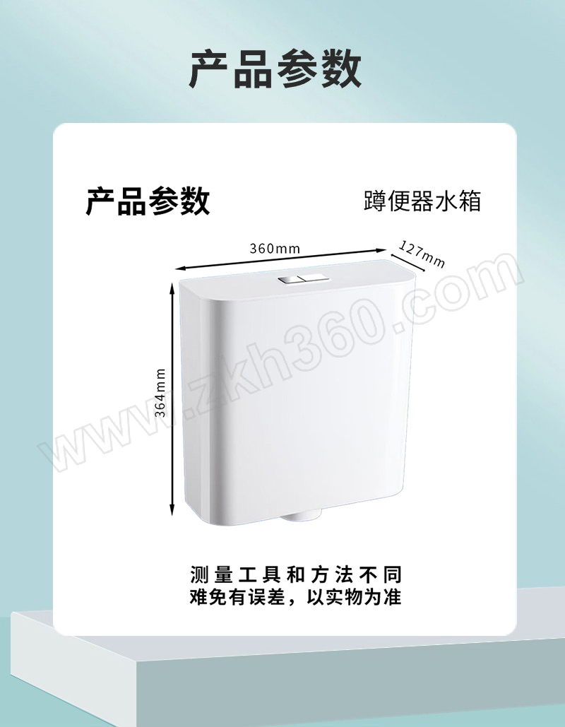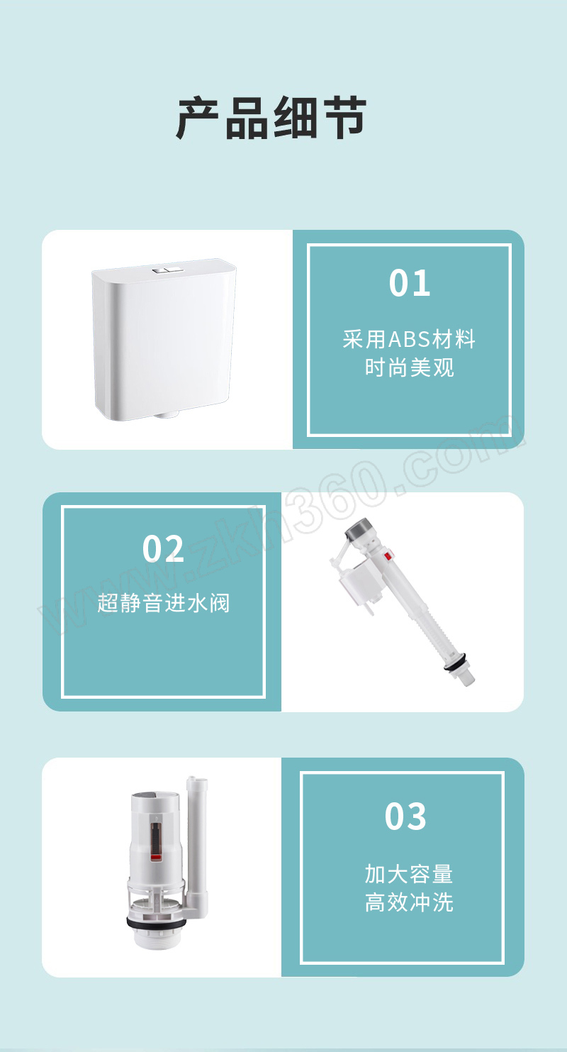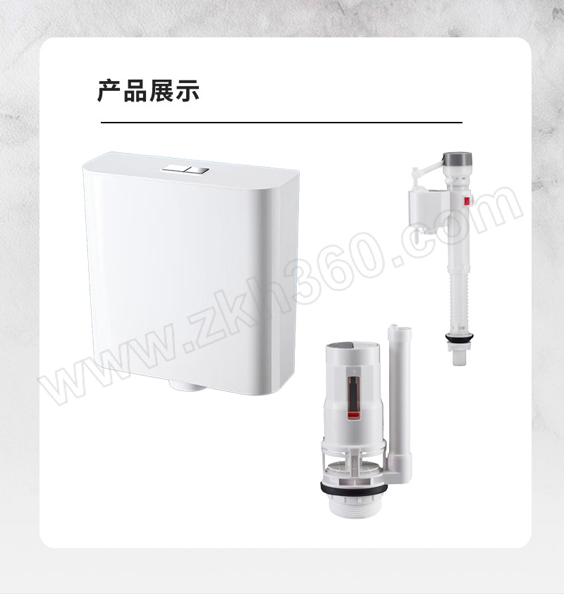 ·加强冲力,按键回弹力强,耐用防漏水,加厚箱体,大容量水箱,双档按钮,低档3L水量,高档8L水量,排水管径55mm,安装孔距300mm
