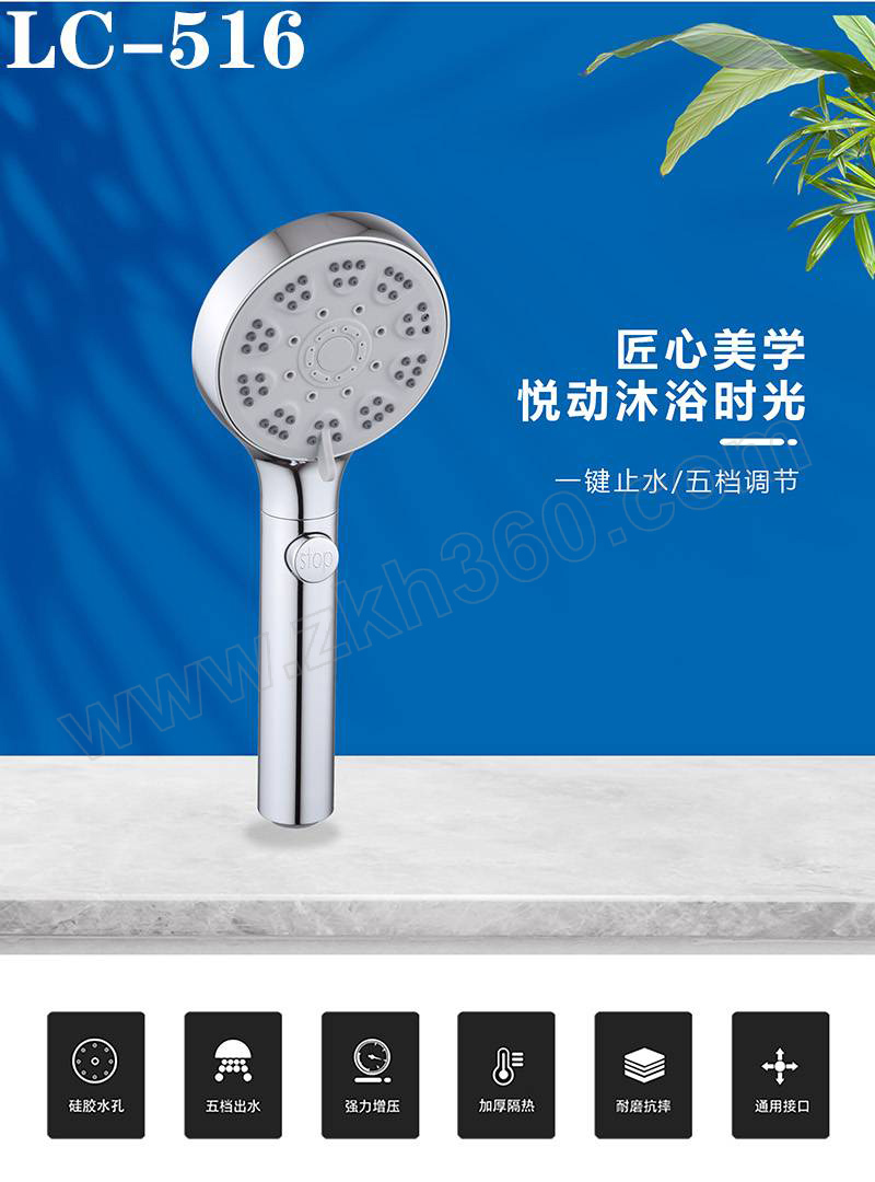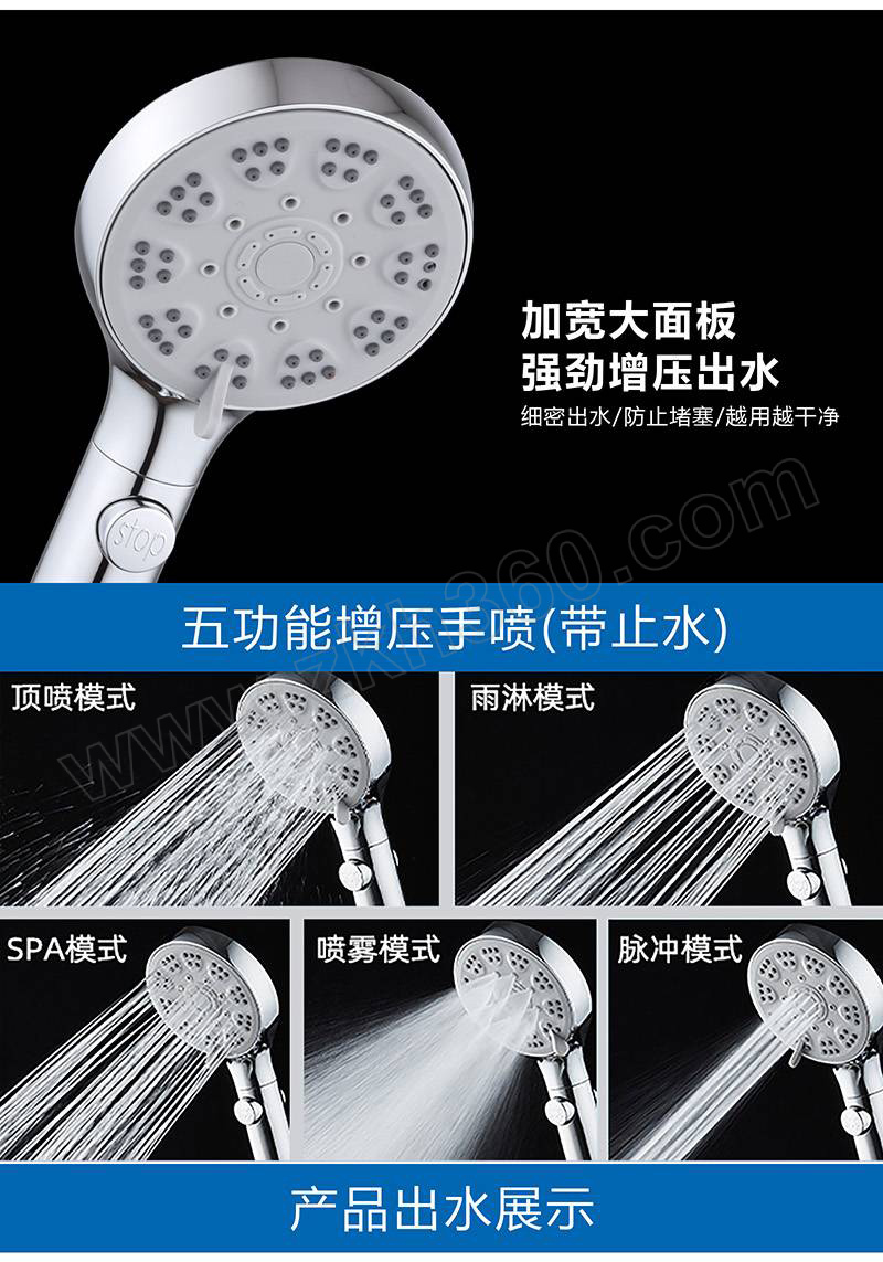 ·五档出水,强力增压,加厚隔热,耐磨抗摔,通用接口,增压出水