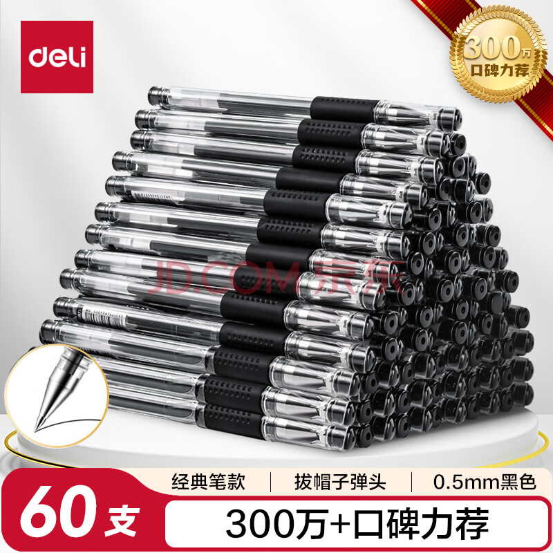 得力(deli)60支办公中性笔签字笔水笔 0.5mm子弹头黑色33109 办公用品
