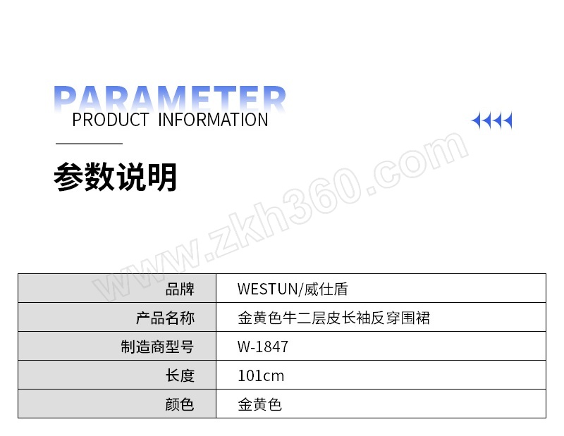 ·方便穿戴,牛二层材质,耐磨耐用 ·可以抵挡焊接飞溅物及辐射 ·长度101cm